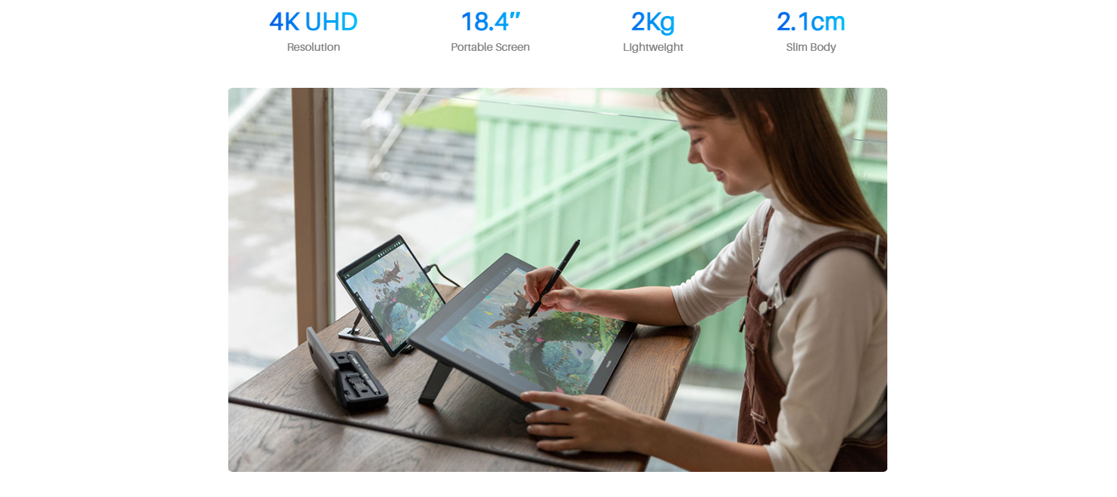 The first-of-its-kind 18.4-inch Kamvas pen display offers UHD 4K (3840*2160) resolution, ensuring crystal-clear images. Its