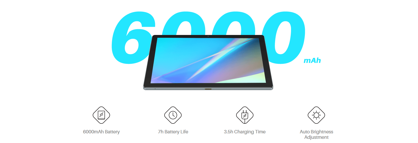 The high-capacity 6000mAh battery supports up to 7 hours of usage on a single charge, and the auto brightness adjustment
