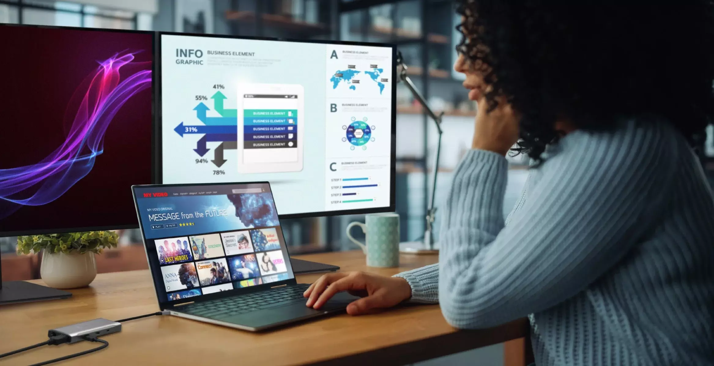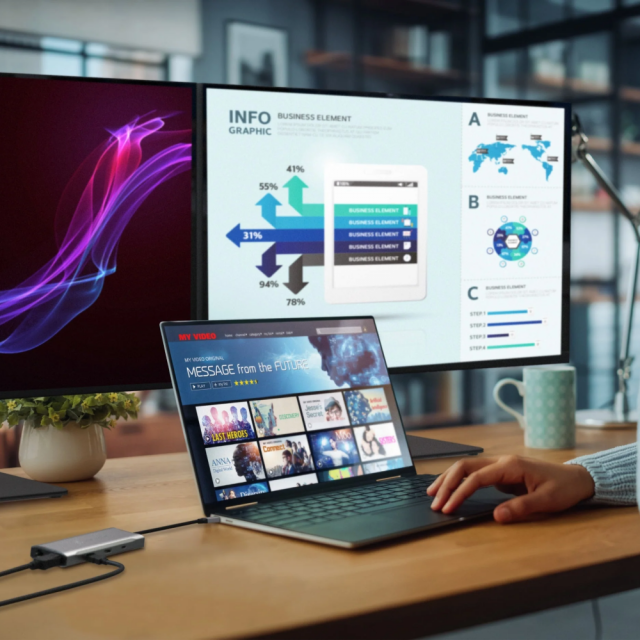 Create a dual or triple 4K workstation with two HDMI and a DisplayPort output on compatible USB-C laptops with DisplayPort 1.4 and Multi-Stream Transport (MST)