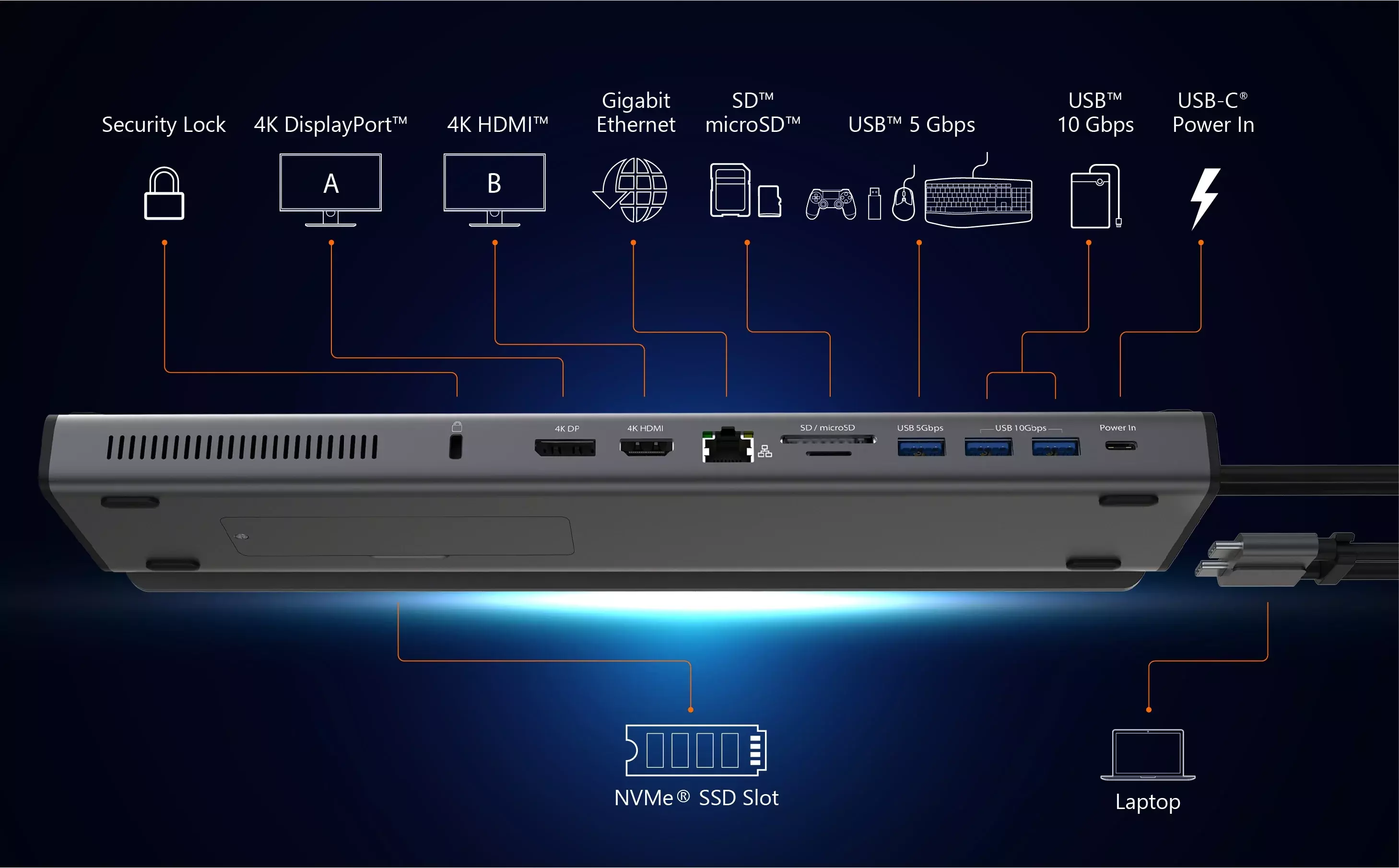 USB-C съвместим лаптоп в двойна 4K работна станция с до 10 Gbps. Тази високопроизводителна докинг станция включва a