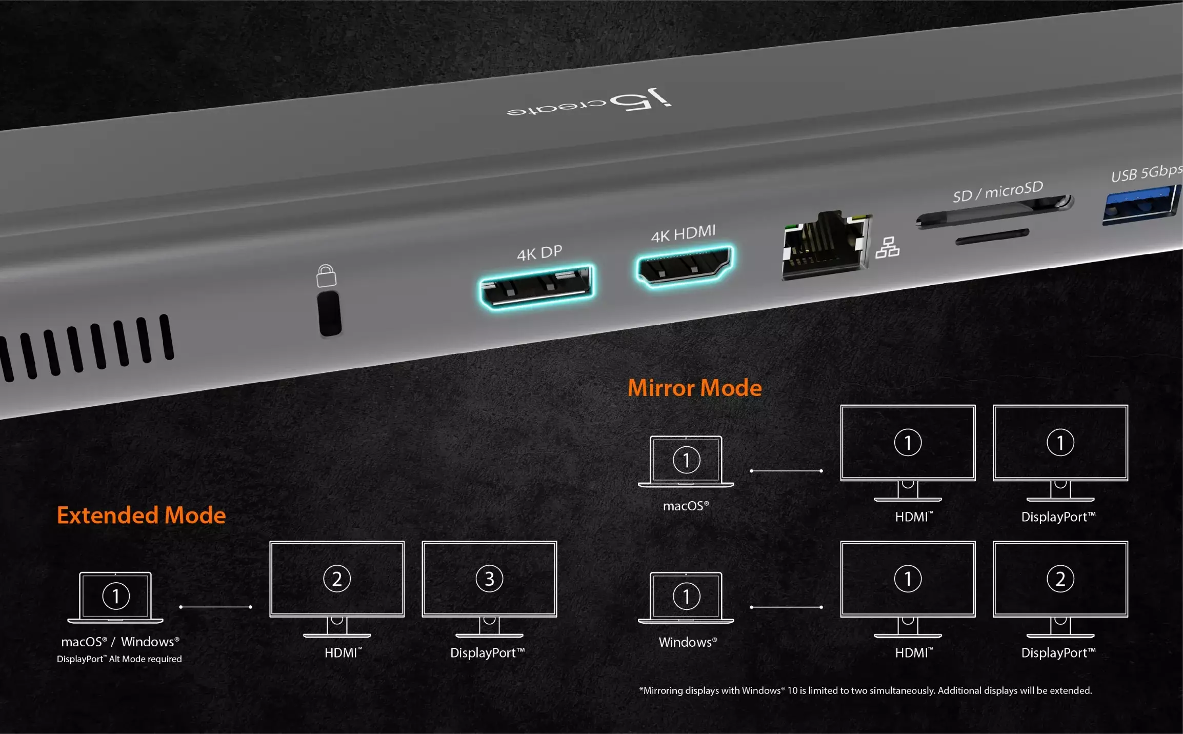 DisplayPort alternate mode allows you to connect two 4K 60 Hz displays via HDMI and DisplayPort or add a single 4K HDMI display when the docking station is connected to only one USB-C host