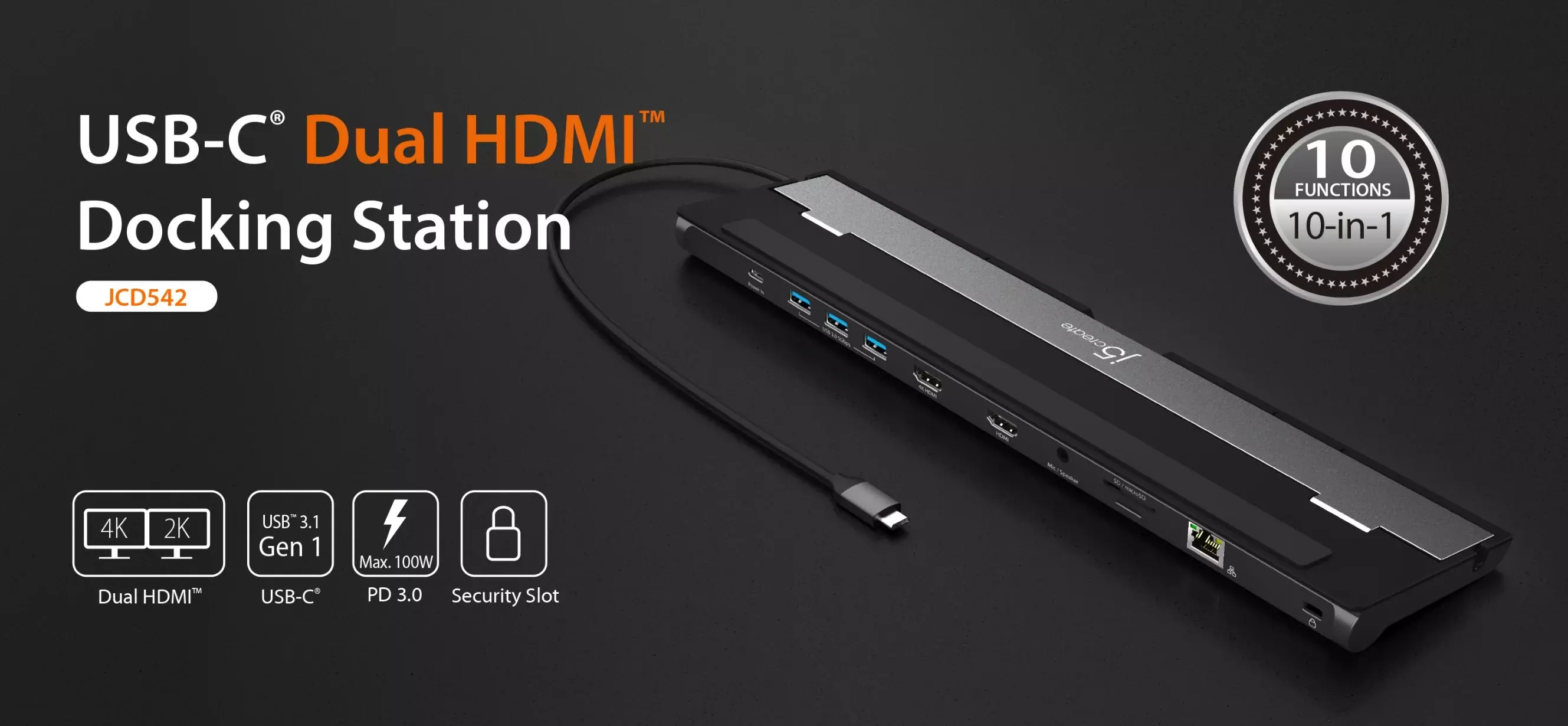 Докинг станция j5create JCD542, За два монитора, 100W PD