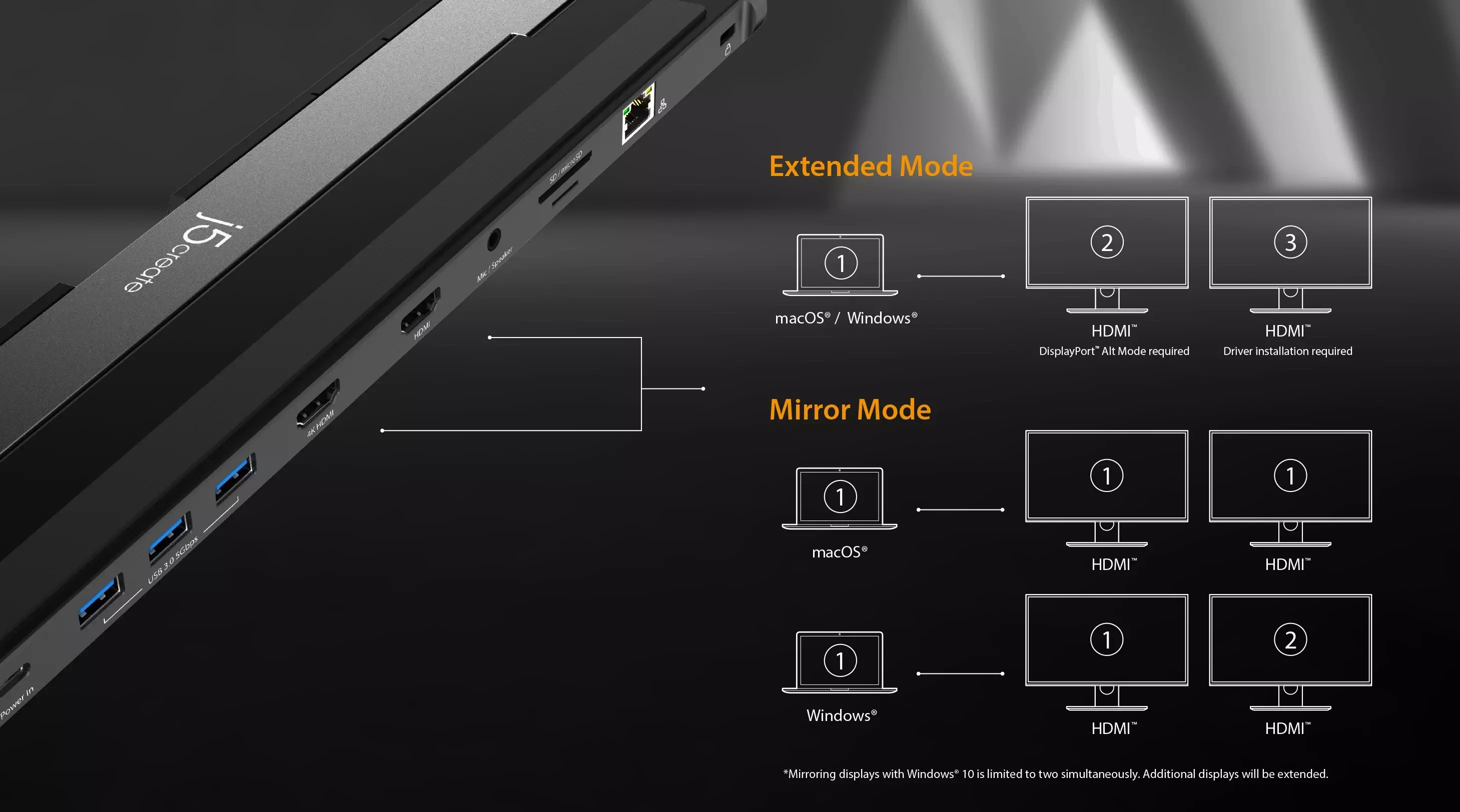Create a dual-monitor set up and boost your productivity. One of the HDMI ports can output resolutions up to 4K, while the other can output resolutions up to 2K.