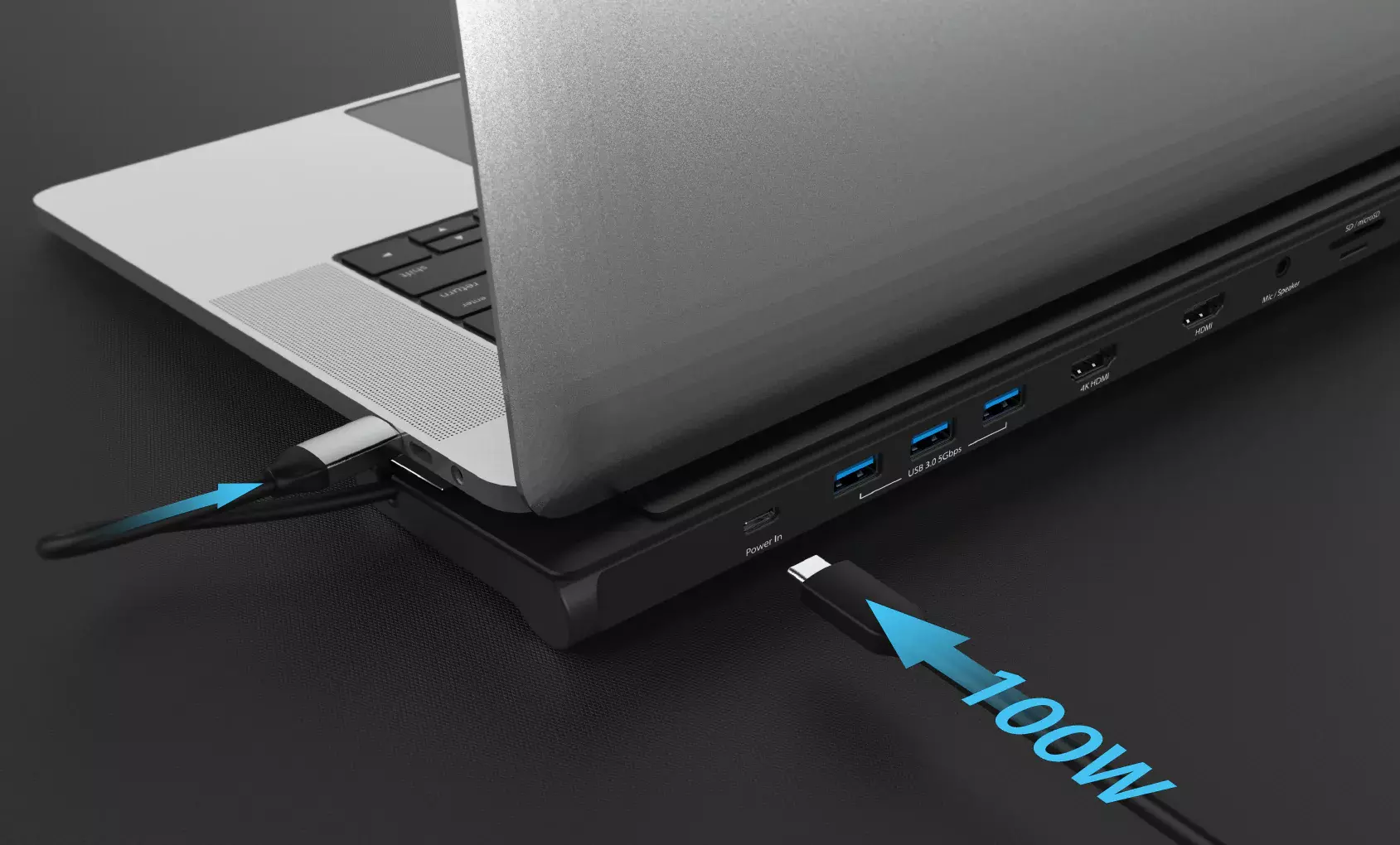 - До 100 W захранване за зареждане на лаптоп и захранване на свързаните периферни устройства (когато се използва с USB-C захранващ адаптер)