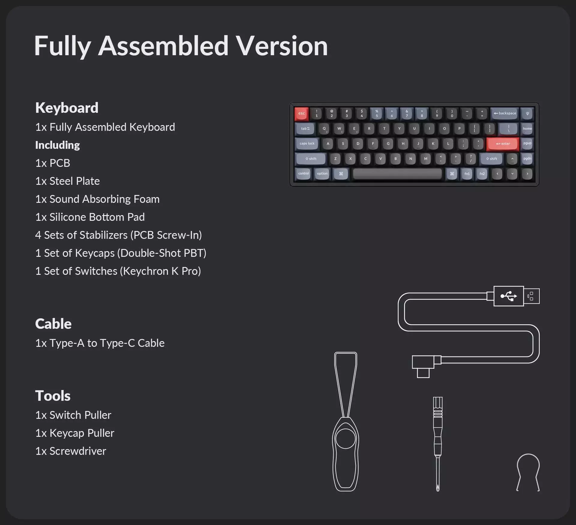 | Switches (Not including Barebone Version): | Keychron K Pro Mechanical | Keycap Material (Not including Barebone Version): | Double-shot PBT |