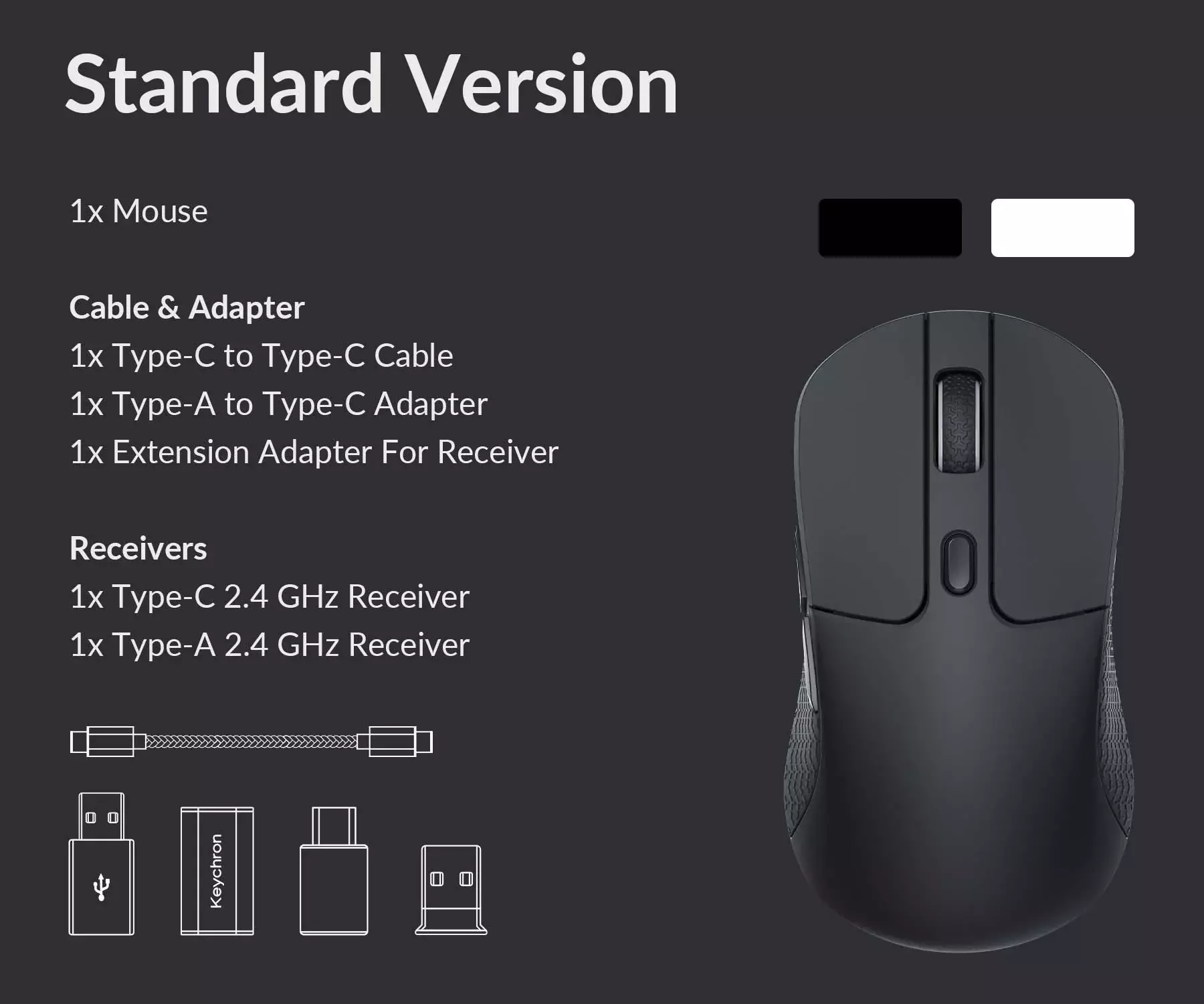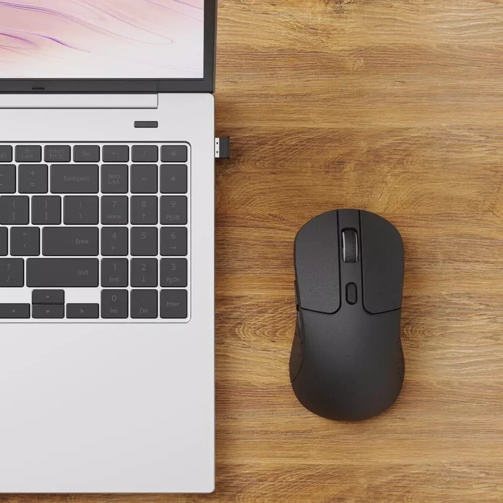 We designed the smallest Type-C 2.4 GHz receiver and a Type-A 2.4 GHz receiver for the mouse. You can pick either of them, plug it in, and play instantly.