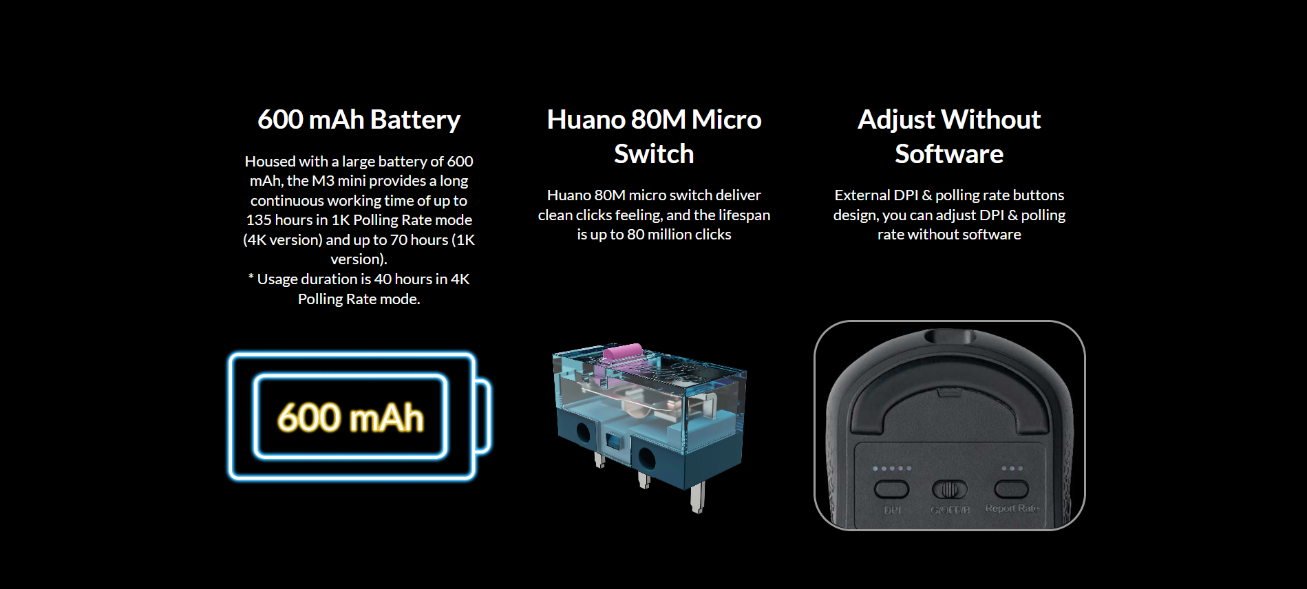 | Sensor | PixArt 3395 | Battery | 600 mAh |