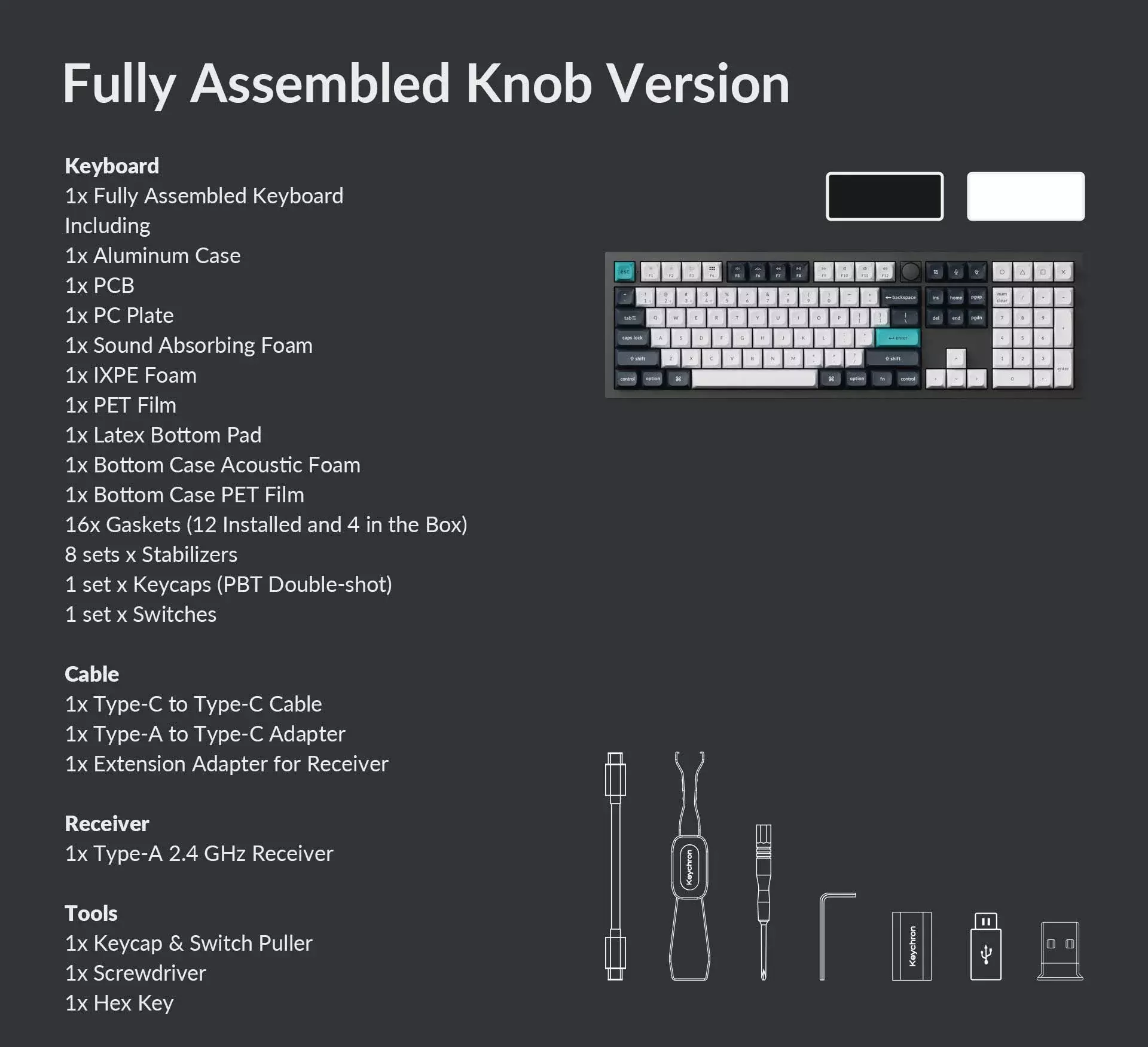 | Keycap | KSA double-shot PBT keycaps, not shine-through (Fully Assembled version) / OSA side-printed double-shot PBT keycaps (Fully Assembled version) | Connectivity | 2.4 GHz / Bluetooth / Type-C wired |