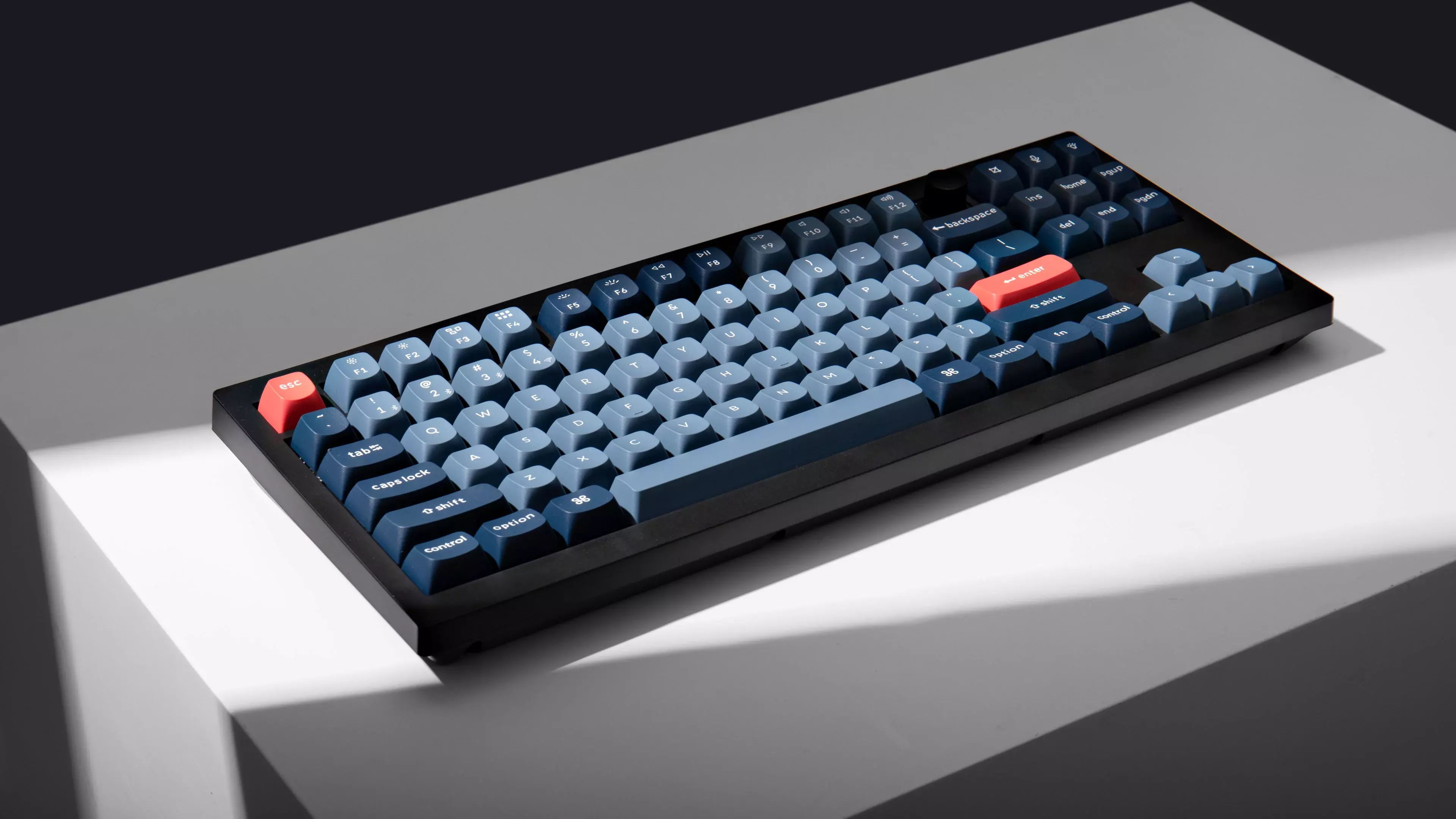 angle with the premium non-shine-through PBT keycaps installed. The south-facing RGB is also free