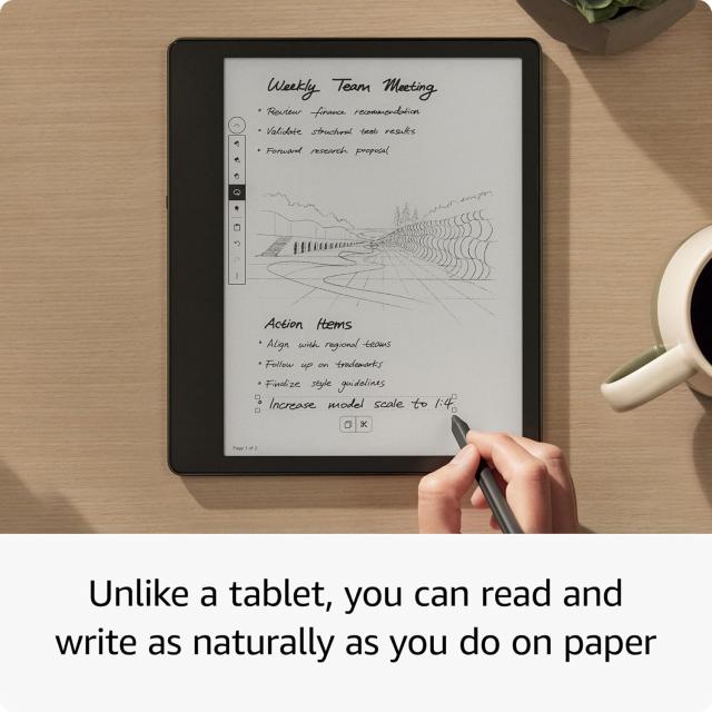 Kindle Scribe комбинира голям 10.2-инчов E-Ink дисплей с естествено усещане за писане върху хартия. Устройството позволява четене на електронни книги и документи, водене на бележки, създаване на тефтери и анотиране директно върху PDF файлове. Подходящ е както за любители на четенето, така и за професионална употреба – преглед на документи, водене на записки и организиране на идеи.