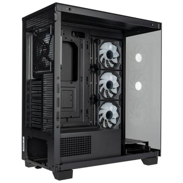 Класическото черно покритие служи като перфектна рамка и фон, докато стъклото от край до край предоставя панорамен изглед към интериора. С дизайн без необходимост от инструменти, страничният стъклен панел разполага с бързо освобождаване отзад, което улеснява достъпа до шасито за инсталация и ъпгрейди.