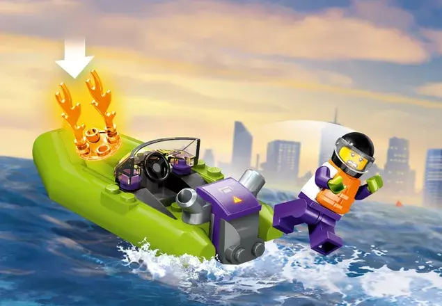 на лодката и джетпака на пожарникаря, за да погасят пламъците LEGO. Просто добавете включените 3 минифигурки и