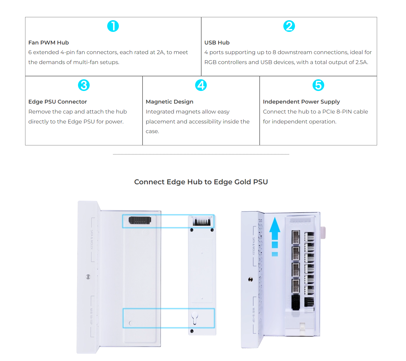 Introducing the world’s first PSU with a detachable USB and PWM fan hub that also functions independently, and that features a removable magnetic dust filter. This unique form factor reorients the connectors outward, simplifying cable management and ensuring a clean, organized build.