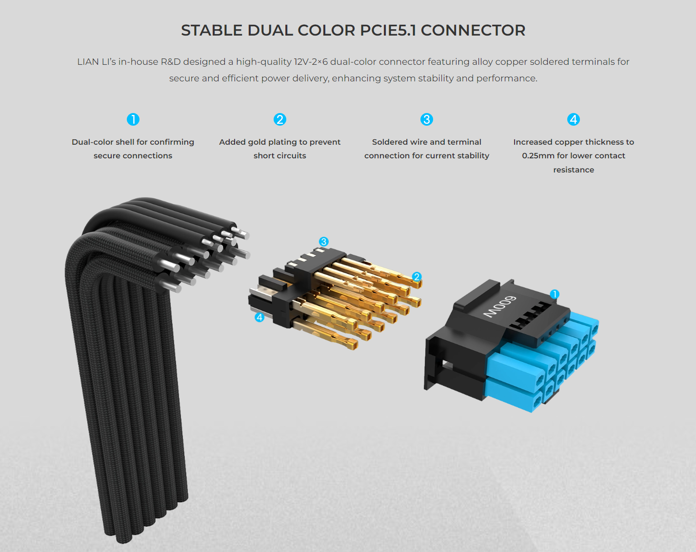| CONNECTORS | 1 x 24/20-Pin motherboard connector (620mm) x1pcs 1 x 8 pin CPU/ATX 12V connector (750mm) x1pcs 1 x 4+4 Pin CPU connector (750mm) x1pcs 1 x 6+2 Pin GPU connector (650mm+100mm) x1pcs 1 x SATA connector (300mm-15mm-15mm-15mm) x1pcs 1 x SATA-Y connector (375mm-150mm-150mm) x 1pcs 1 x SATA connector (400mm-150mm-150mm-150mm) x1pcs 4 x 4-Pin Peripheral connector (500mm-150mm-150mm-150mm) x1pcs 1 x 12V – 2X6 450W connector (650mm) x1pcs 2 x 6+2 Pin GPU connector (650mm) x2pcs |