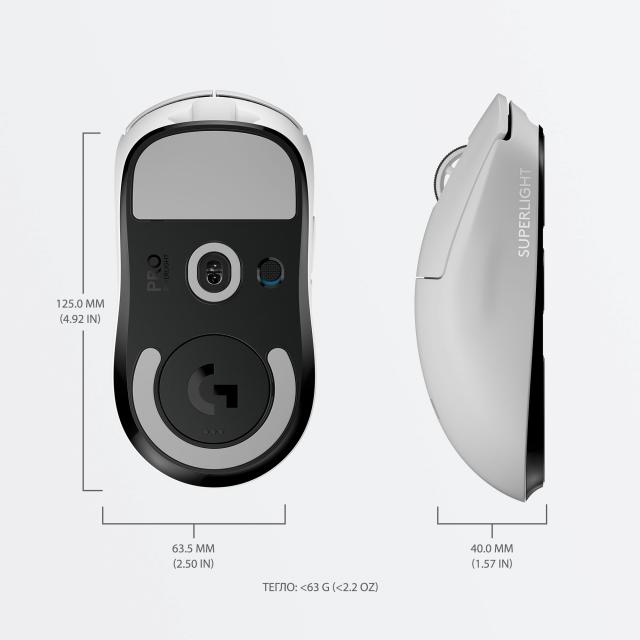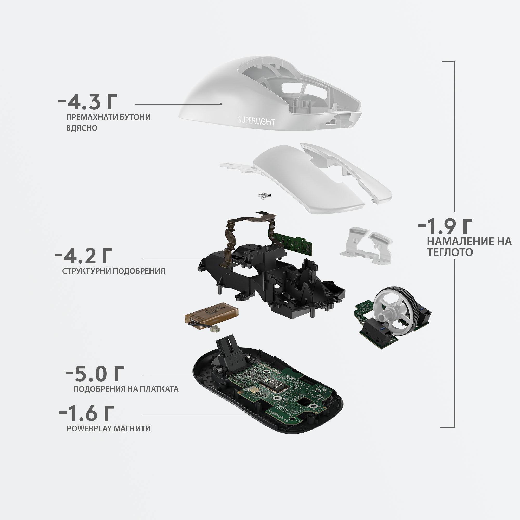 G PRO X SUPERLIGHT - нашата най-лека PRO мишка за момента, е инженерно чудо, тъй като тежи под 63 г. Това означава, че тя е е с приблизително 25% по-лека от нашата стандартна PRO Wireless мишка. Успяхме да го постигнем чрез безброй щателни инженерни проучвания за редуциране на теглото, без това да повлияе на работата на мишката.