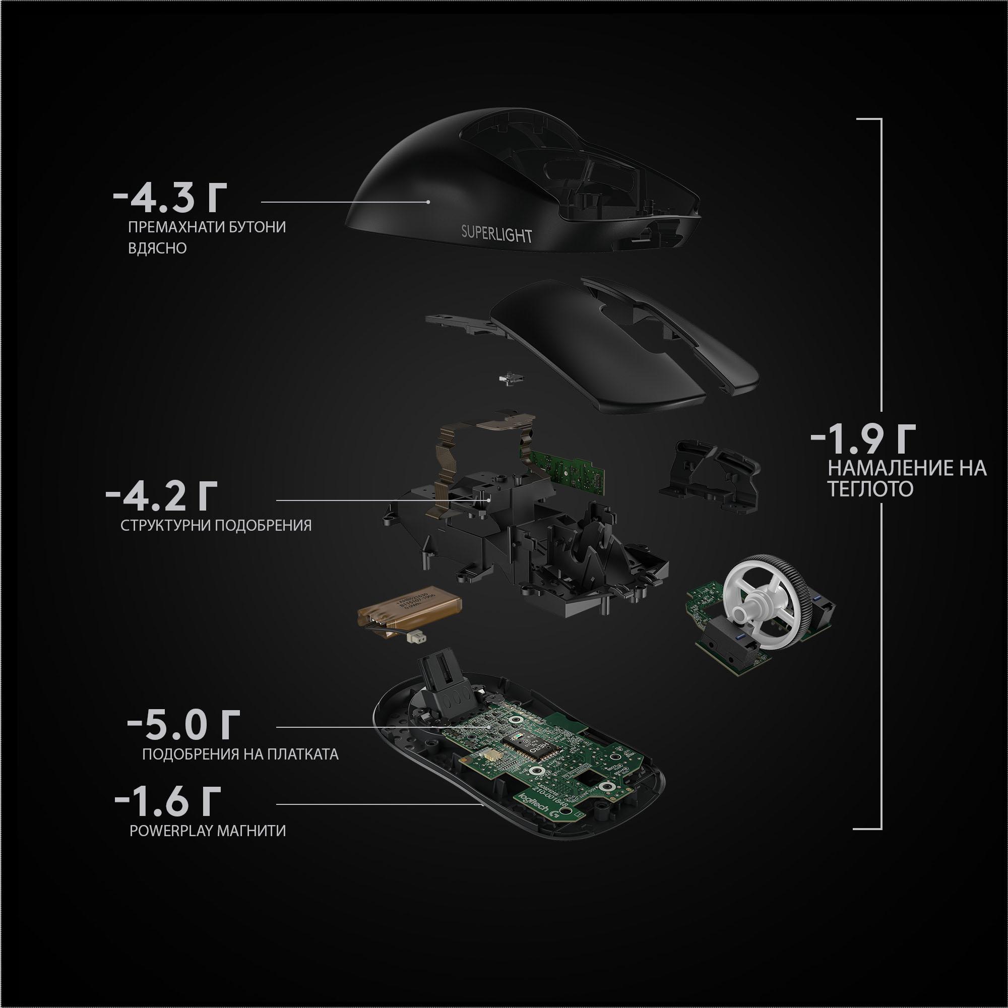 G PRO X SUPERLIGHT - нашата най-лека PRO мишка за момента, е инженерно чудо, тъй като тежи под 63 г. Това означава, че тя е е с приблизително 25% по-лека от нашата стандартна PRO Wireless мишка. Успяхме да го постигнем чрез безброй щателни инженерни проучвания за редуциране на теглото, без това да повлияе на работата на мишката.
