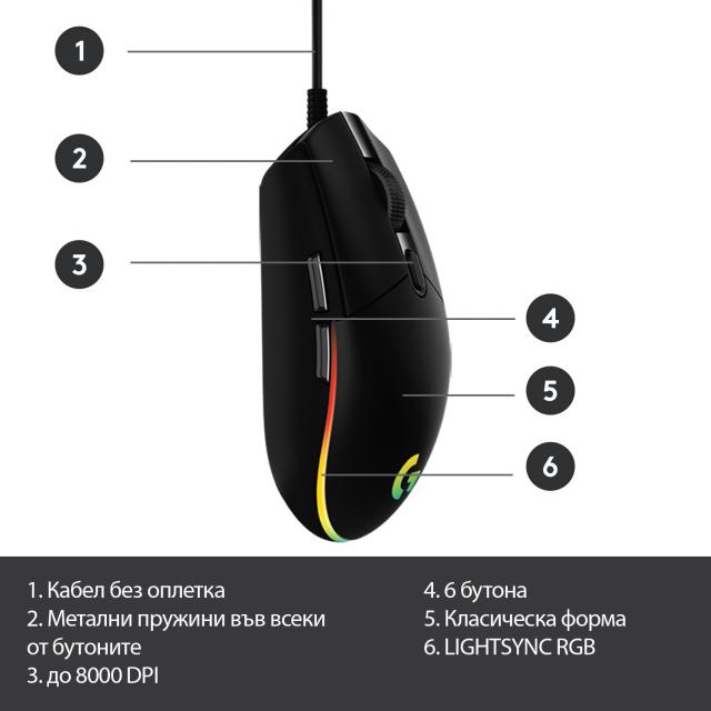 Усетете комфорта и абсолютния контрол върху мишката. Изпитана във времето, класическата форма на G102 разполага с 6 перфектно разположени бутона, което я прави супер удобна и предпочитана от геймърите. Всеки от бутоните може да бъде програмиран чрез Logitech G HUB софтуера изключително лесно.