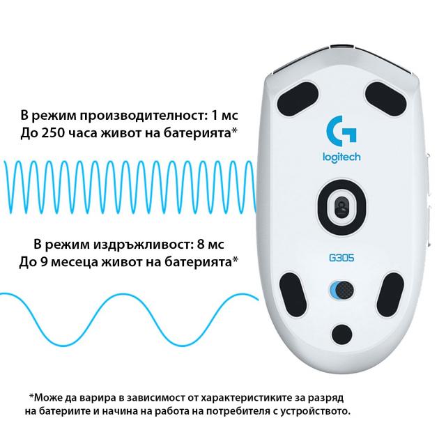 Играйте на пълни обороти, без да се притеснявате за батерията. G305 може да се пoxвали с невероятните 250 часа работа на максимално представяне с 1ms report rate и в режим "Performance", само с една АА батерия. G305 разполага със светлинен индикатор за батерията, който почва да мига с червена светлина, за да ви информира, че остават 15% заряд. Може да удължите живота на батерията до 9 месеца, ако изберете режим "Endurance" през софтуера на Logitech. Режим "Endurance" работи с 8ms report rate.