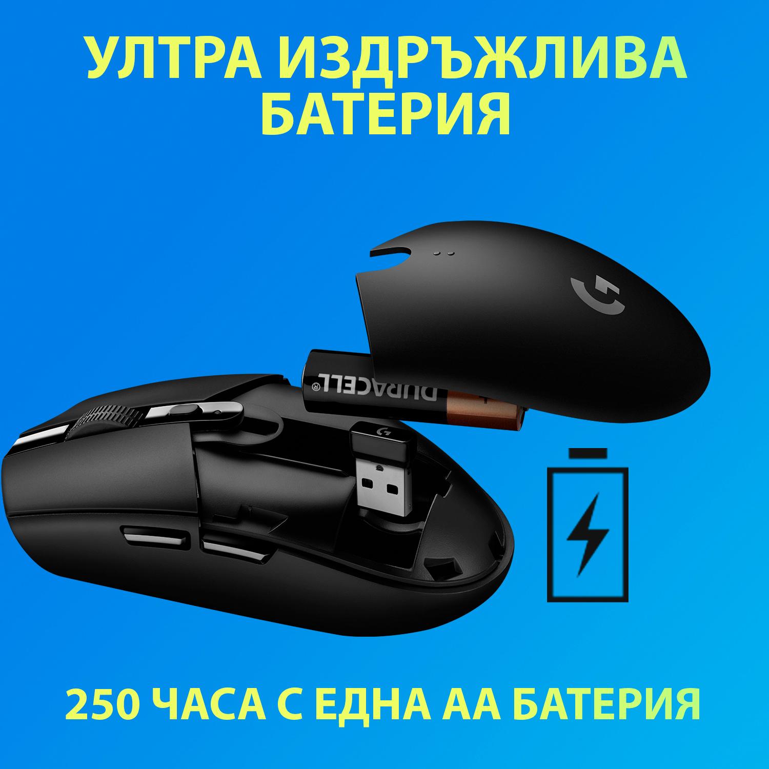 HERO сензора и LIGHTSPEED технологията осигуряват изключителна ефективност, за да ви позволят да играете в продължение на 250 часа само с една AA батерия. Очаквайте около 9 месеца типична употреба при най-висока производителност, преди да се наложи да смените батерията си и не се безпокойте, G305 има индикаторна светлина, която ви напомня, че остава 15% батерия.