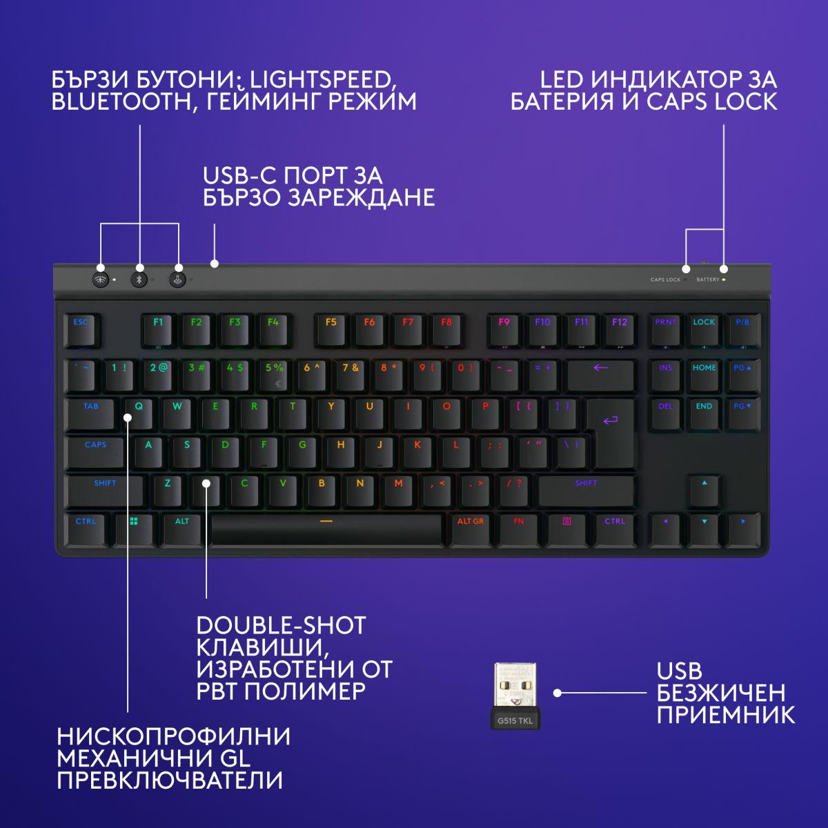 Безжична геймърска клавиатура Logitech G515 Lightspeed TKL