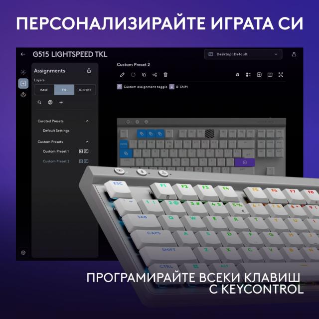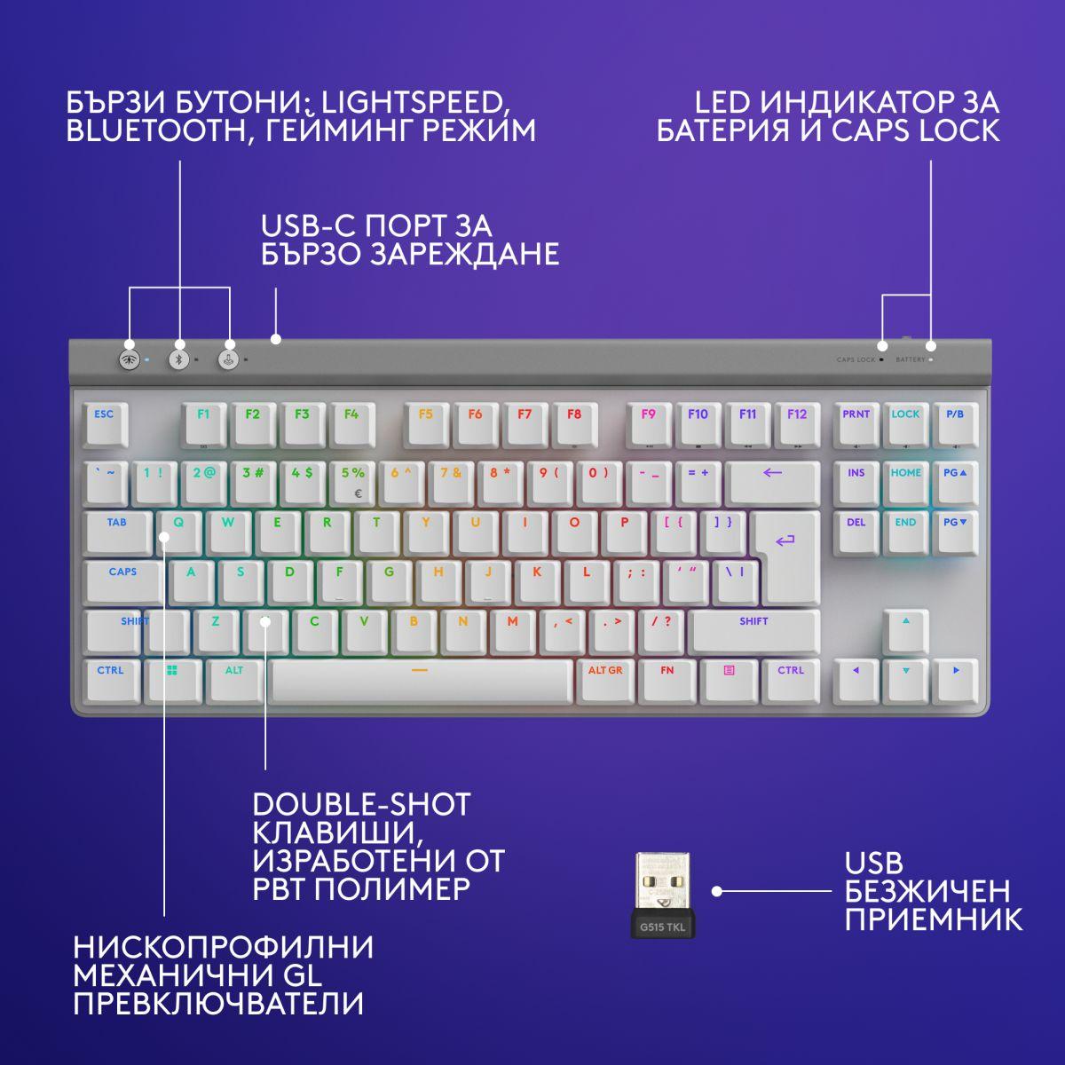 Безжична геймърска клавиатура Logitech G515 Lightspeed TKL White