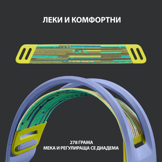 Само 278 г - това е теглото на 2 малки чийзбургера или 250 желирани бонбончета. G733 са супер леки и благодарение на ластичната им лента никога няма да ви натежат или убиват, а ще седят перфектно балансирани на главата ви, за да продължите да играете необезпокоявано.