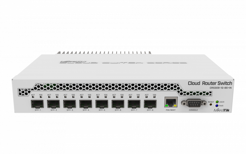 CRS309-1G-8S+ е много компактен, но мощен суич. Той има осем SFP+ слота, поддържащи до 10 Gbit модул във всеки,
