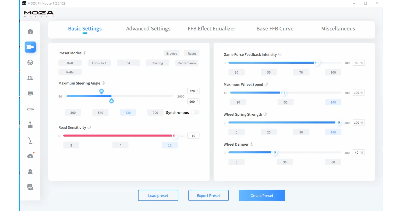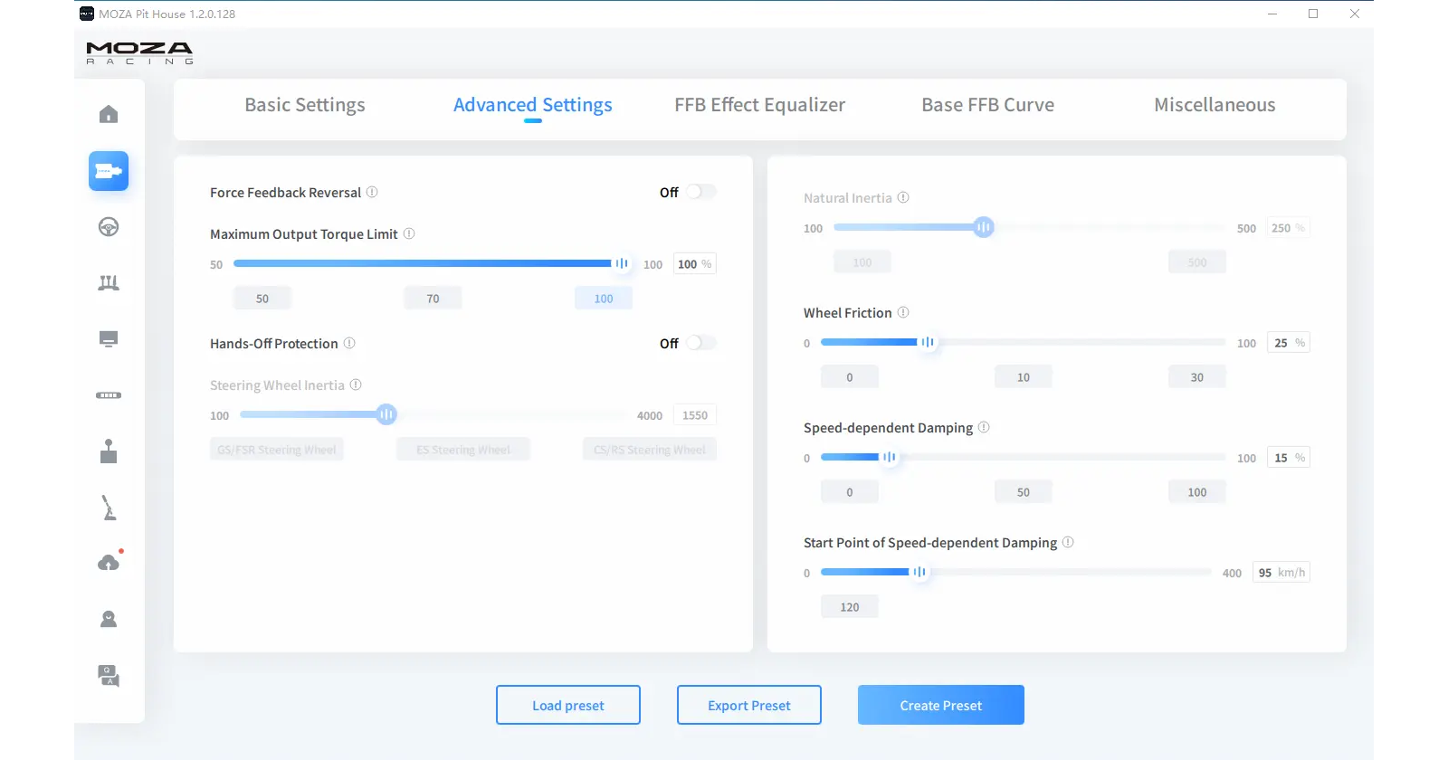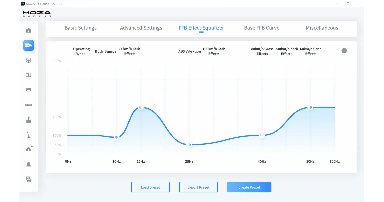 FFB еквалайзерът на MOZA позволява пълна персонализация и фино настройване на спектъра на ефектите от обратната връзка,