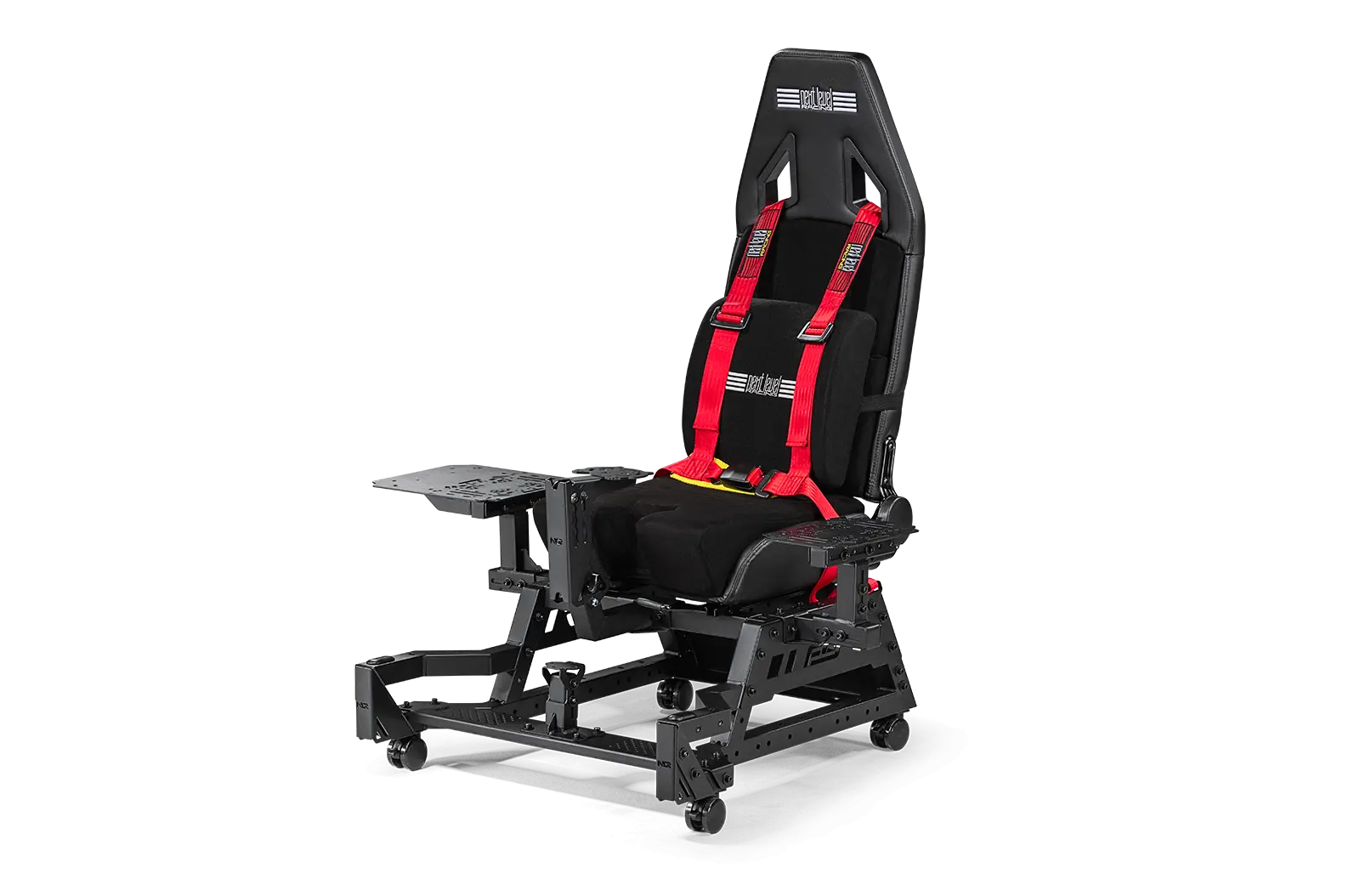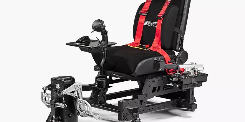 A Flight Seat that is suited for a wide range of aviation users. The Next Level Racing Flight Seat Pro Features a wide frame design for extra stability and a center HOTAS mounting pole with height and angle adjustment, making it compatible with major brands, including Thrustmaster, VIRPIL, WINWING, and more. For added comfort and immersion during long flight sessions, the Flight Seat Pro includes a safety footstep, lumbar cushion, and seat harness, with a variety of flight plates that are compatible with a wide range of throttles and HOTAS peripherals on the market. With an ergonomically designed flight seat and support for helicopter and space setups, the Flight Seat Pro is the perfect choice for pilots of all levels. Plus, with included lockable castor wheels, the cockpit can be easily transported to different locations, making it the ultimate choice for professionals and enthusiasts alike. Flight users can place their Flight Seat Pro in front of their desk to achieve a genuinely immersive experience. Combine the Flight Seat Pro with the Next Level Racing Flight Stand Pro to create the most versatile flight cockpit on the market for the most immersive flight experience. For a more immersive experience, the Flight Stand Pro is also compatible with Next Level Racing Motion Plus Platform and Motion Platform V3.