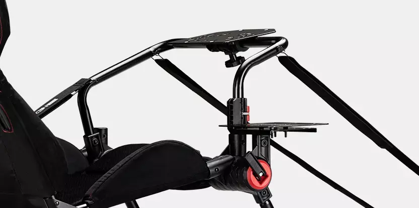The GTLite Pro racing cockpit offers shifter support with the inclusion of the Next Level Racing Universal Handbrake plate, allowing the user to use both shifter and handbrake simultaneously, and is compatible with all major shifter manufacturing brands thanks to its updated mounting holes. The pedal support is also improved with wider pedal plates, compatibility with all major pedal manufacturing brands, improved pedal frame hinge design, and quick-release ratchet cams for easily sliding the pedals forward or backward in seconds. Undoubtedly, these adaptive features have garnered praise from thousands of customers who love the original compact design of the GTLite.