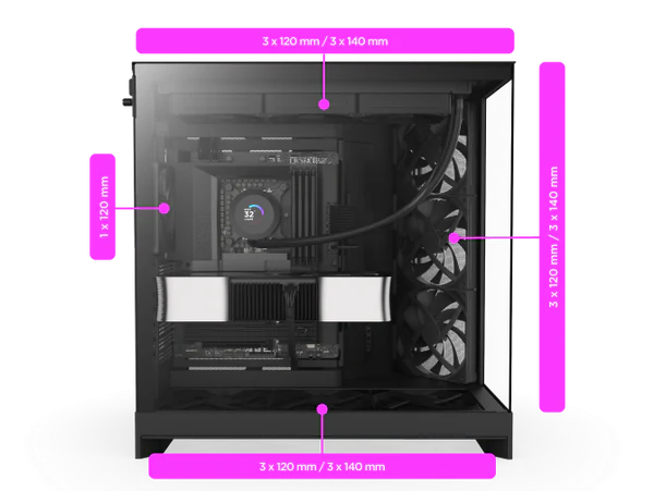 Fits up to nine 140 mm fans and one 120 mm rear fan.