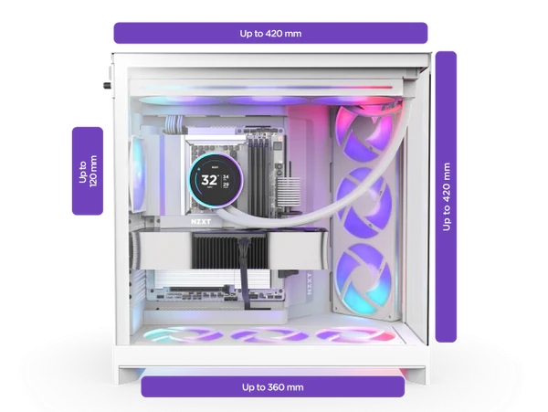| Top Radiator & Fan Thickness | Up to 80 mm (360 mm) Up to 62 mm (420 mm) |