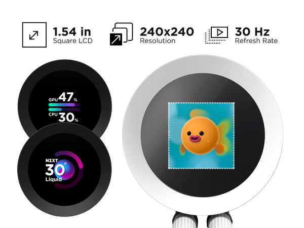 YouTube — all on a vibrant 1.54-inch square LCD, fully controlled through NZXT CAM.