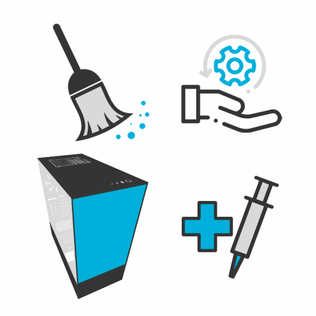 Разглобяване на конфигурацията. Почистване с компресор на компонентите и кутията. Сглобяване на конфигурацията. Смяна на термо паста на процесора. Тест на системата.