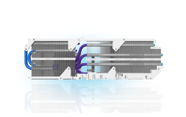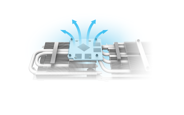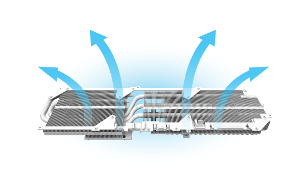 Four 6φ nickel-plated copper heatpipes are aligned above the PCB, optimizing heat transfer from the GPU and VRAM to the cooling array.