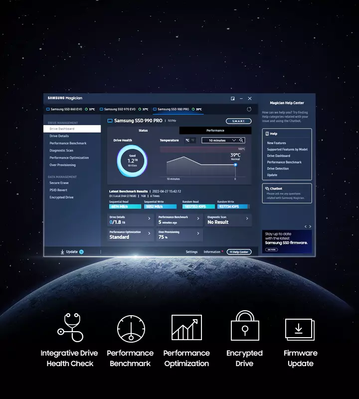 Отключи пълната мощност на 990 PRO. Удобният за потребителя пакет от инструменти за оптимизация винаги ти осигурява най-добрата SSD производителност. Защита на данни, актуализации, мониторинг на изправността на диска и избор на LED цветови комбинации - всичко това в твоя личен SSD инструментариум.