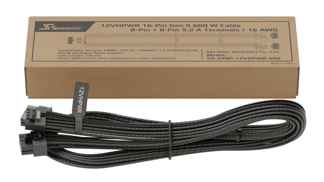 - Кабелът 12VHPWR, предоставен с вашето захранване на Seasonic, е с мощност 600 W. Това означава, че максималната допустима мощност от захранването от VGA може да бъде до 600 W. Ако вашият VGA консумира много енергия, моля, помислете захранващи устройства с мощност от 750 W и по-висока.