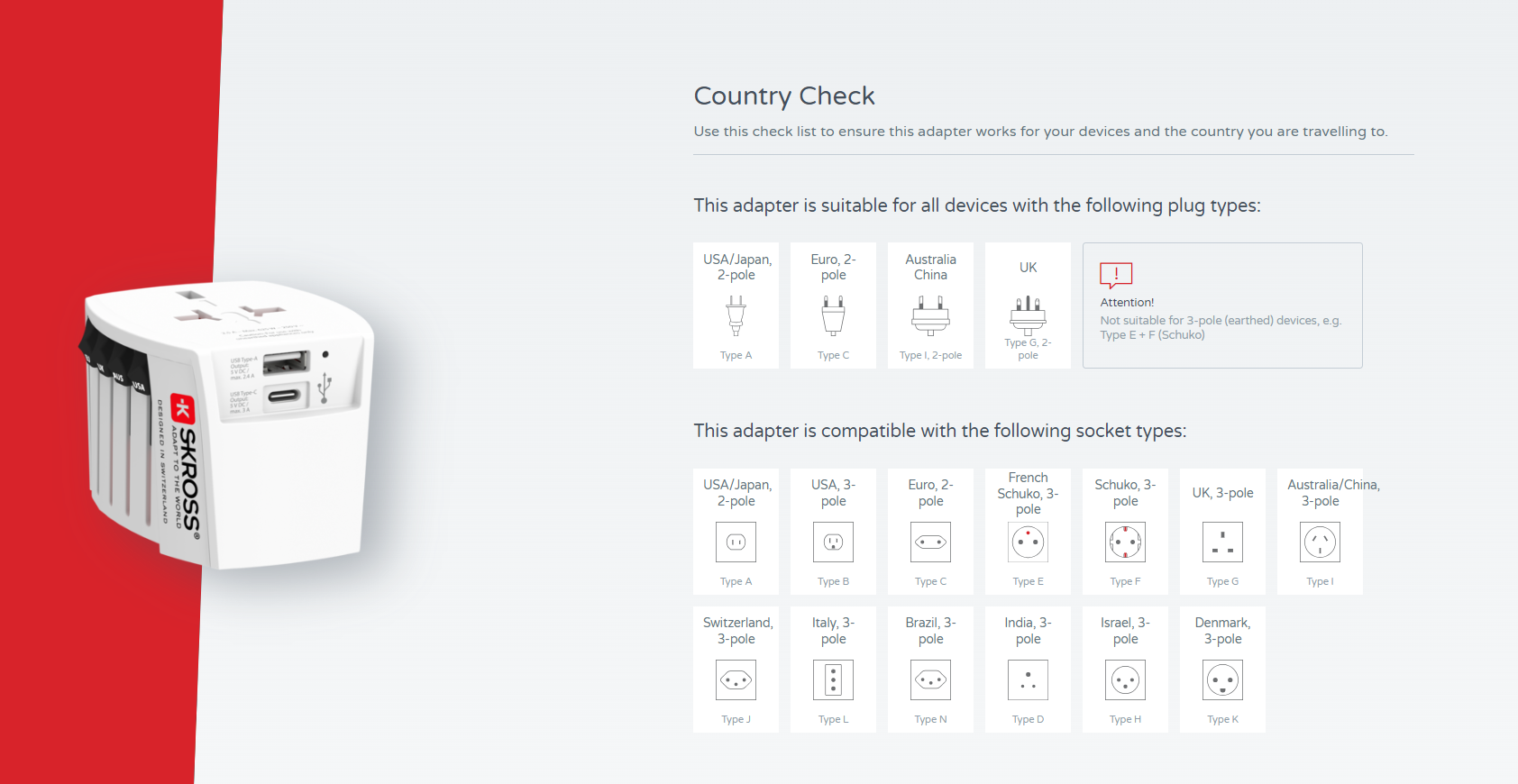 | Към щепсел | Euro, French Schuko, Schuko, USA/Japan, USA, UK 3-pole Type G, Australia/China 3-pole Type I, Switzerland, Italy, Brazil, Denmark, India, Israel |