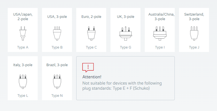 Входни конектори: Евро, Австралия/Китай, Великобритания, САЩ/Япония, Швейцария, Италия, Бразилия