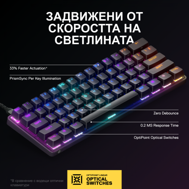 Направи първата крачка с невероятно бързата геймърска клавиатура Apex 9 Mini. Благодарение на сменяемите оптични бутони OptiPoint, които се задействат с 33% по-бързо в сравнение с водещите продукти на пазара, регулирай силата за натискането на бутоните между 1 мм за игри и 1,5 мм за писане. Играй като професионалистите с геймърска клавиатура с 60% форм фактор, която ти оставя повече пространство за придвижване на мишката, и възможността за оптимизиране на настройките. Алуминиевата горна част е от материал, използван при производството на самолети, е това, от което се нуждаеш при поредната си победна серия и ще ти даде ненадмината издръжливост. Отключи потенциала на тази клавиатура и я персонализирай с лекота в SteelSeries Engine.