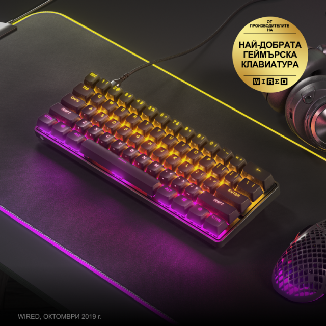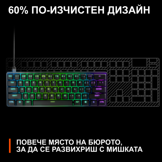 - Компактен 60% форм фактор - Оптимизираният дизайн спестява място на бюрото и оставя повече опространство за движение на мишката, като запазва възможностите на стандартна клавиатура благодарение на странично отпечатаните функции.