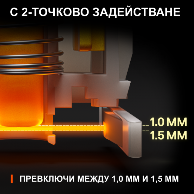- С 2-точково задействане — Адаптира се към всяка игра, като променя дълбочината на натискане от бързо и леко натискане от 1 мм до фокусирано върху точността натискане на клавиши от 1,5 мм.