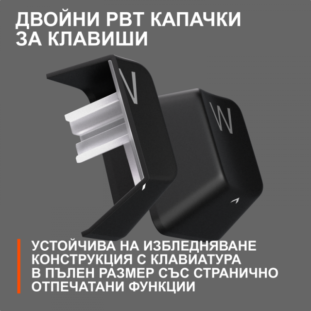 - Издръжливи PBT клавиши — Издържливите двойни PBT клавиши са с висококачествена текстура за по-добро усещане при натискане и подобрена точност на писане.