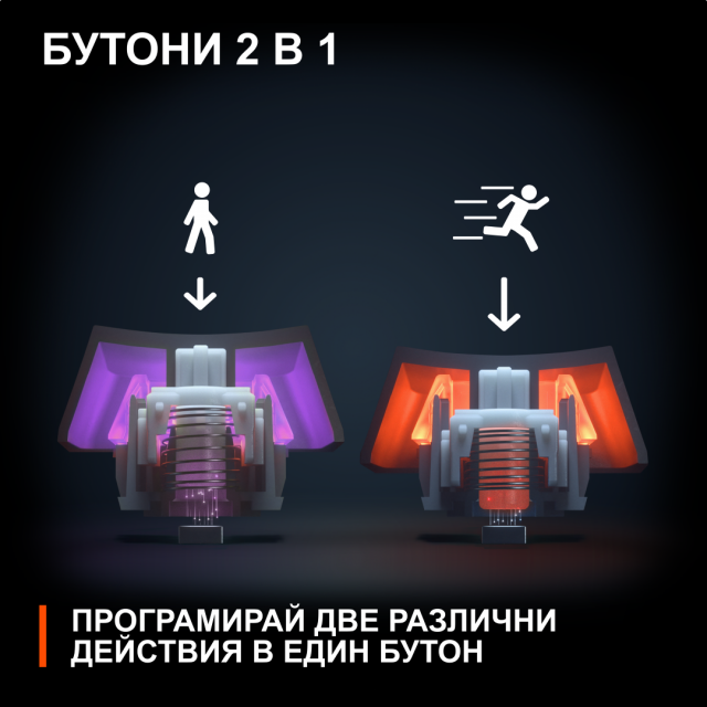 Програмирайте две действия за един бутон в зависимост от начина, по който го натискате. Вървете напред с леко натискане на клавиша, а след това спринтирайте, като натиснете същия бутон по-дълбоко. Създайте свои собствени творчески комбинации с помощта на SteelSeries Engine, за да победите конкуренцията.