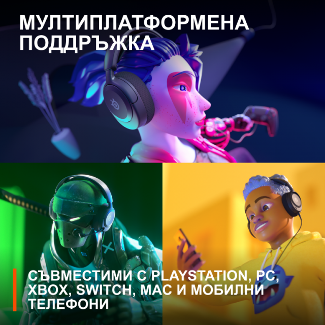 Almighty Audio никога не е било по-достъпно, тъй като Arctis Nova 1Р съчетават хардуер и софтуер, за да осигурят превъзходно качество на звука с висококачествени драйвери, поглъщащо 360° пространствено аудио и 10-лентов параметричен еквалайзер за множество настройки. Системата ComfortMax позволява 4 точки на регулиране, с които лесно се намира перфектното прилягане на леките слушалки, снабдени с възглавнички AirWeave Мемори. Микрофонът с изолиране на шума и идеален звук намалява фоновите звуци, като осигурява ясна комуникация по време на игра, а вие се чувствате удобно дори по време на дълги игрални сесии. Arctis Nova 1Р разполагат с 3,5-милиметров жак, който работи с почти всяка платформа, включително PlayStation, PC, Xbox, Switch и мобилното ви устройство.