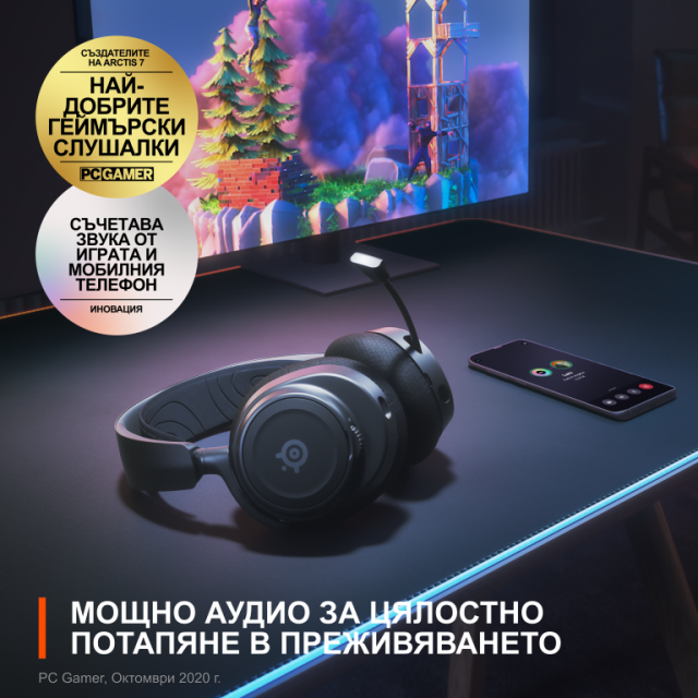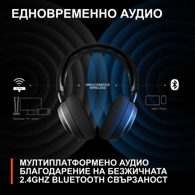 - Двойни аудиопотоци - Смесвайте две аудиовръзки едновременно, за да можете да разговаряте с приятели, докато играете. Играйте с 2,4GHz без забавяне и използвайте Bluetooth едновременно за обаждания, Discord, музика и подкасти.
