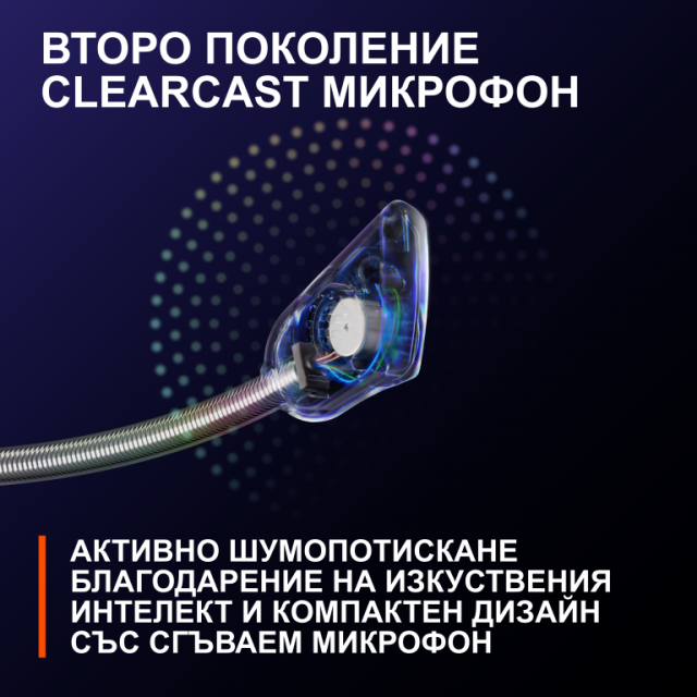 - AI Микрофон със заглушаване на шума - Микрофонът ClearCast от второ поколение заглушава фоновия шум, за да ви осигури кристално чиста комуникация, подкрепена от мощните AI алгоритми на Sonar Software. Пълно прибиране на микрофона в слушалката за по-елегантен външен вид.
