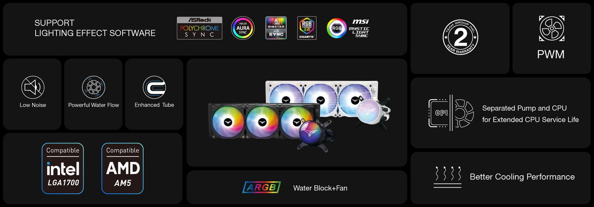 The water block of T-FORCE SIREN GD360E AIO ARGB CPU Liquid Cooler is made of