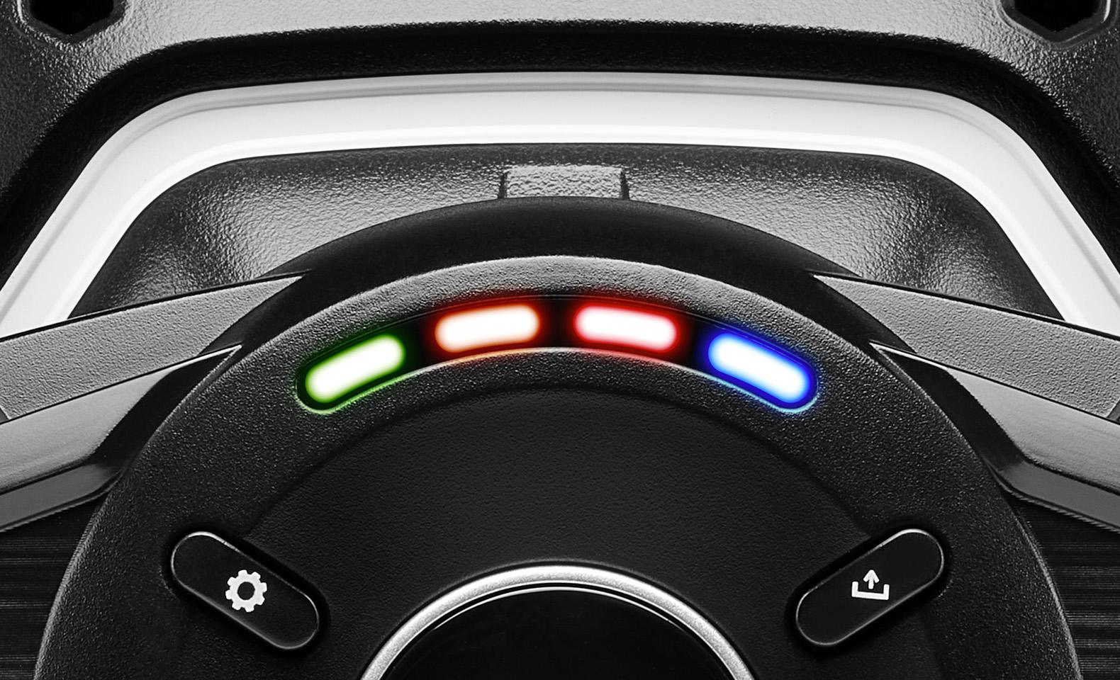 4-цветната LED лента ви позволява да наблюдавате оборотите на двигателя, без да откъсвате очи от пътя. Светодиодите мигат, когато трябва да превключите на по-висока предавка, което ви позволява да оптимизирате превключването на предавките. Списъкът със съвместими игри на XBOX и PC се актуализира редовно на уебсайта за техническа поддръжка на Thrustmaster.