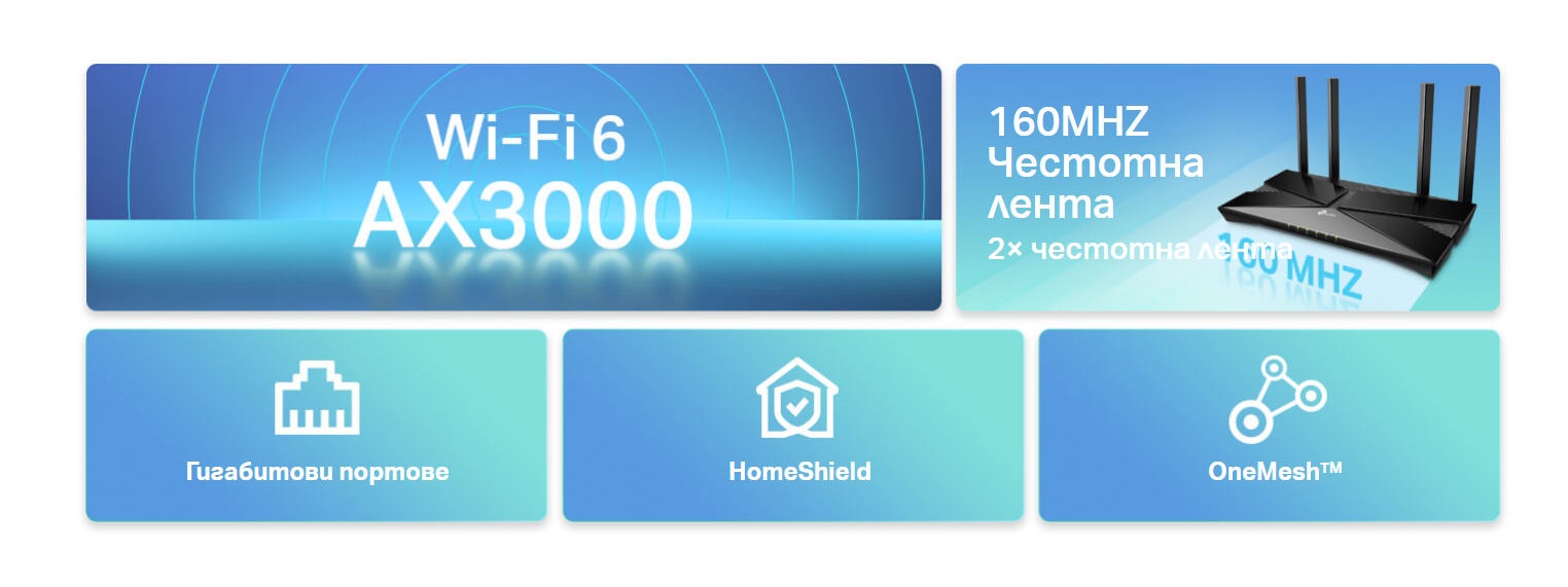 предоставя. С 160 MHz честотна лента и 1024-QAM, Archer AX53 осигурява истински гигабитови скорости до 3 Gbps. Насладете се на по-